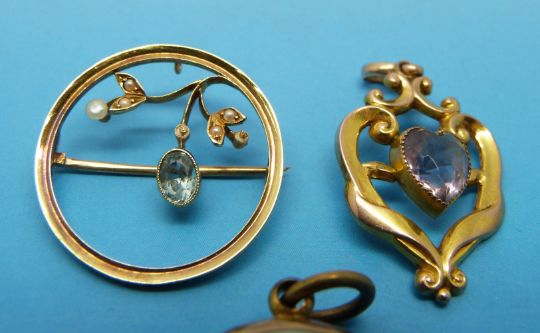 A yellow metal brooch marked 15ct gold set with aquamarine and seed pearls, a yellow metal pendant marked 9ct gold set with a heart cut amethyst and a locket