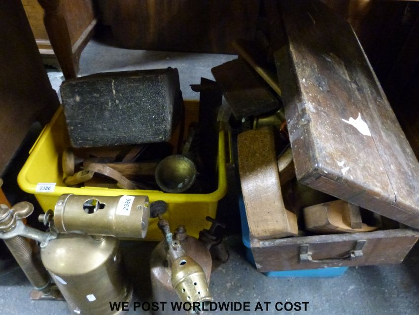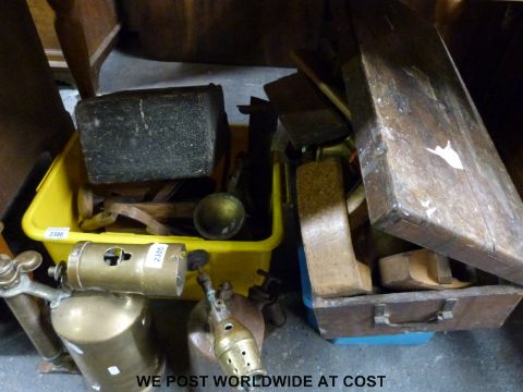 A collection of vintage tools to include woodworking planes, screwdrivers, blowlamps including Primus 607 etc