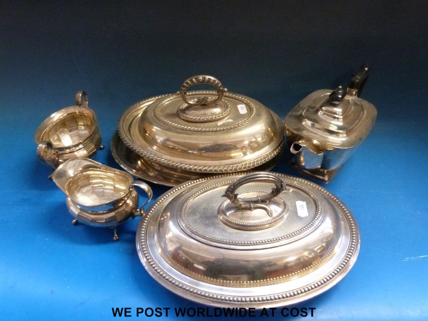 A quantity of silver plate to include entree dishes, teaware, tantalus frame and cut glass handled salad servers