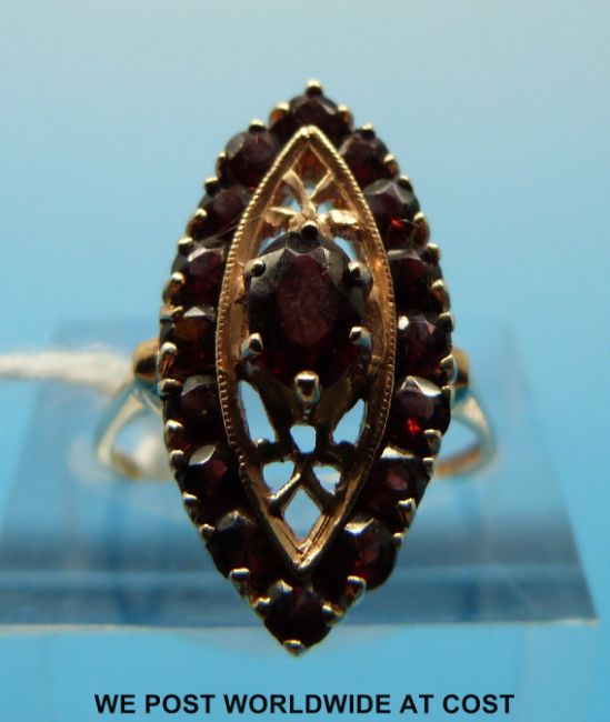 A 9ct gold ring set with garnets in a marquise-shaped setting (size M)