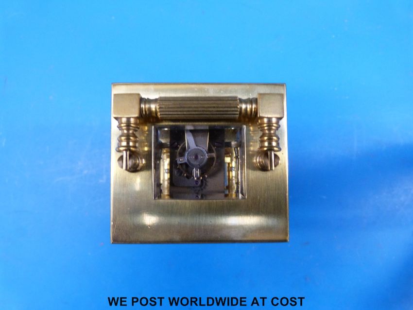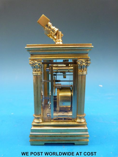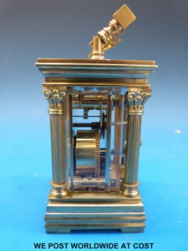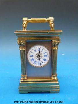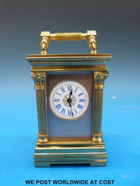 Aiguilles miniature carriage clock with Corinthian columns to corners, the enamel dial with blue Roman numerals, height including handle 10.5cm, with original case and key, numbered 6506 to movement, case and key