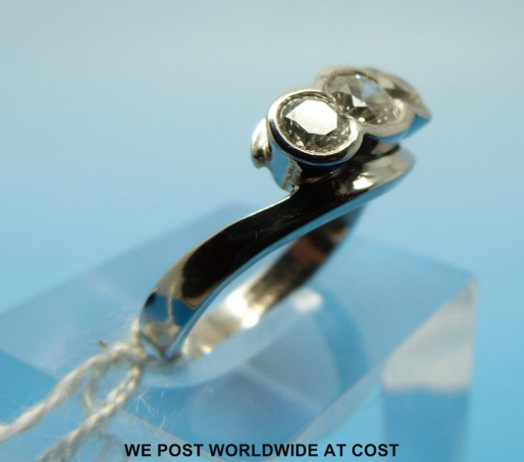 A platinum ring set with three round brilliant cut diamonds in a rub over twist setting, the centre stone measuring approximately 0.4ct the two either side approximately 0.26ct each (size M)