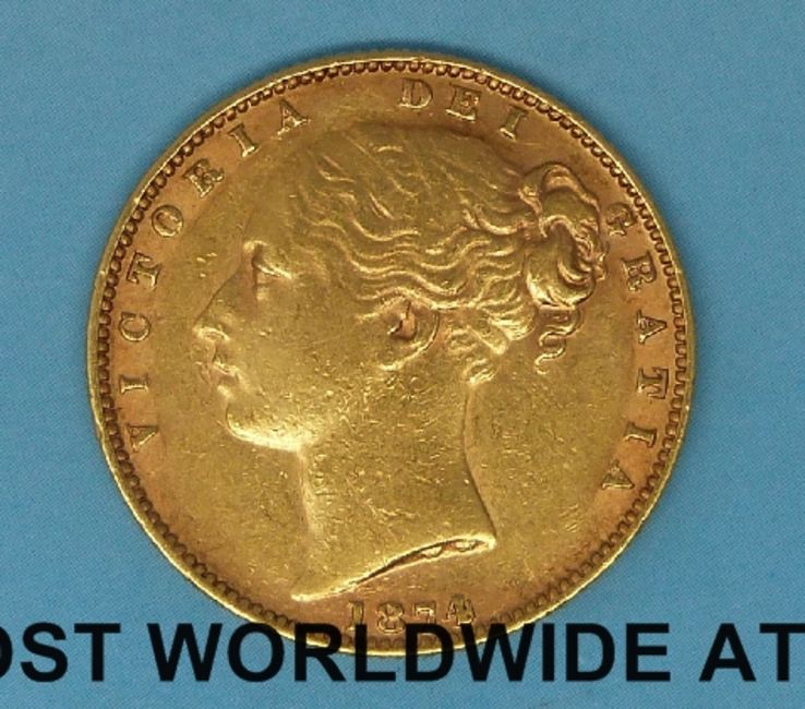 An 1874 young head gold full sovereign shield reverse, Melbourne mint below wreath