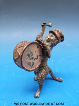 An Austrian cold painted bronze figure of a cat playing a drum (height 6cm)