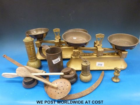 Several sets of scales, weights, brassware etc
