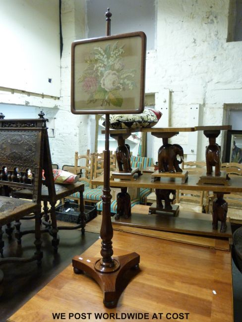 A Victorian mahogany tapestry pole screen on triform base and bun feet (height 145cm)