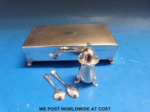 A swing handle silver plated basket, two pierced tazzas and a plated cigarette box etc