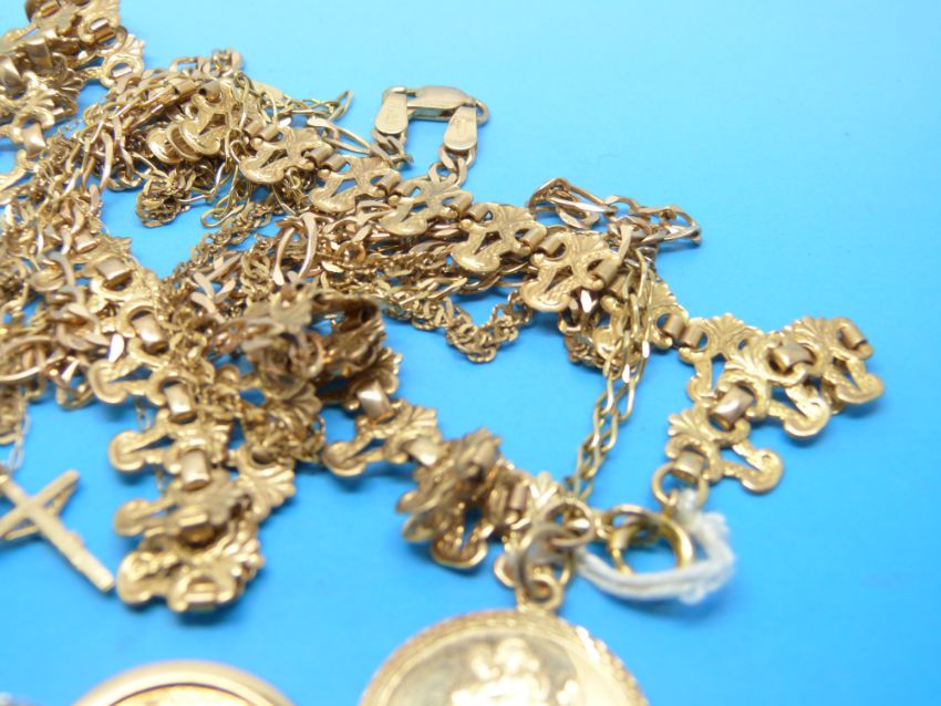 Four 9ct gold necklaces, one with a 9ct gold pendant and three yellow metal necklaces with yellow metal pendants marked 9ct gold (29.5g)