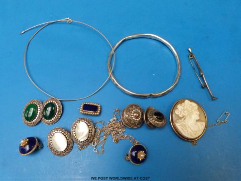 A small collection of jewellery to include silver flapper bangle, Victorian brooch set with pearls, silver brooch, earrings etc