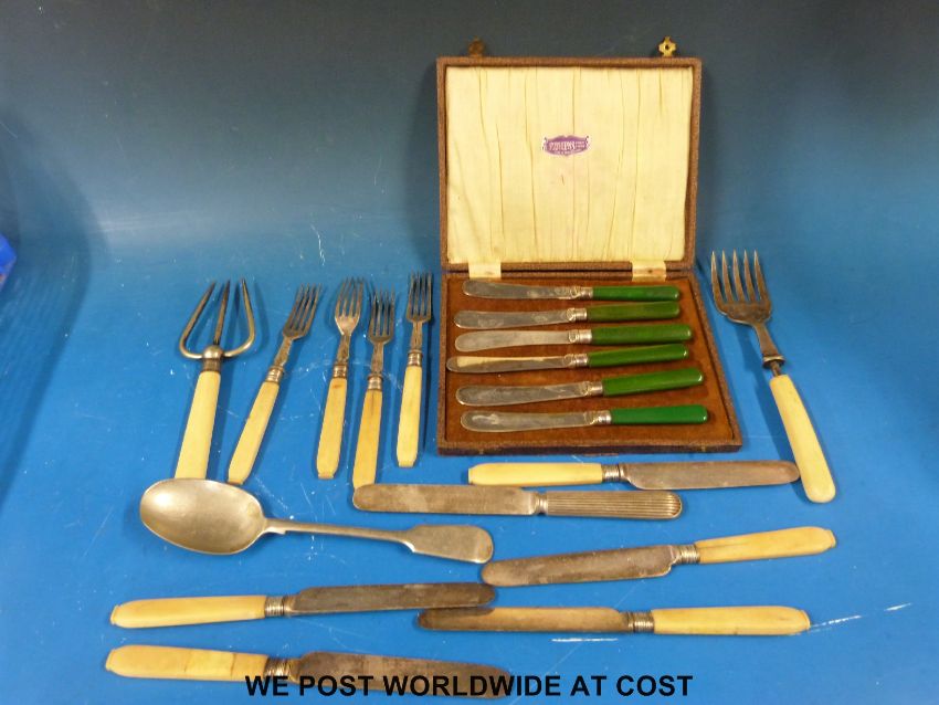 A quantity of silver plated cutlery to include mother of pearl handled set of cased butter knives etc
