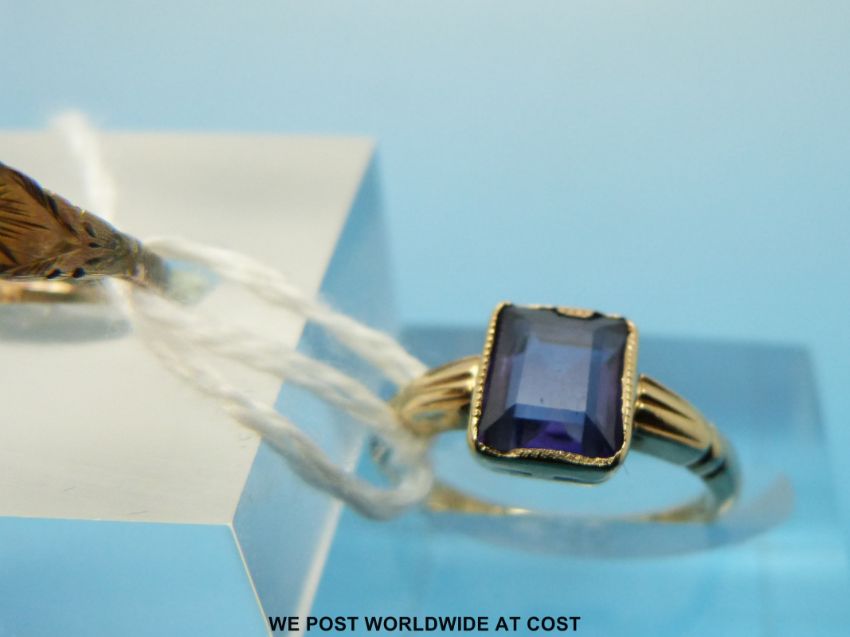 A 9ct gold ring set with an emerald cut amethyst and a 9ct gold ring set with seed pearls and rubies