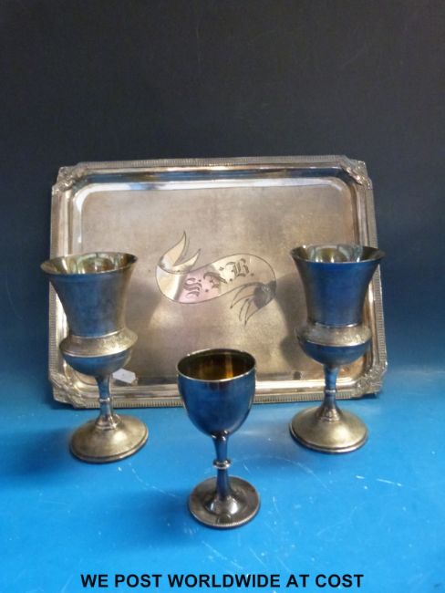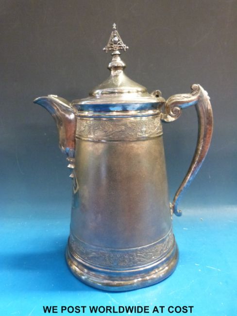 A collection of plated ware including a large decorative jug with pierced finial (height 34cm). All pieces stamped "Middletown Plate" and the jug "James Stimpson 1854 patented" to base together with a hallmarked silver goblet (weigt 66g)