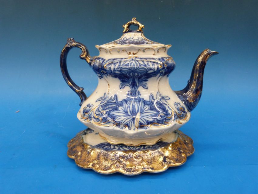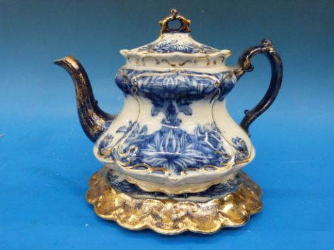 A teapot and stand marked SJB