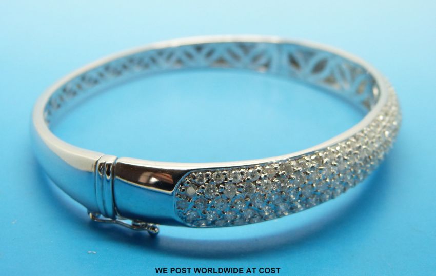 An 18ct white gold bangle, half set with five rows of round brilliant cut diamonds