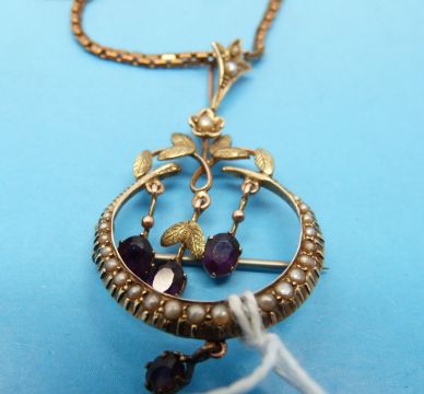 An Edwardian 9ct gold pendant / brooch set with amethysts and seed pearls on a 9ct gold chain