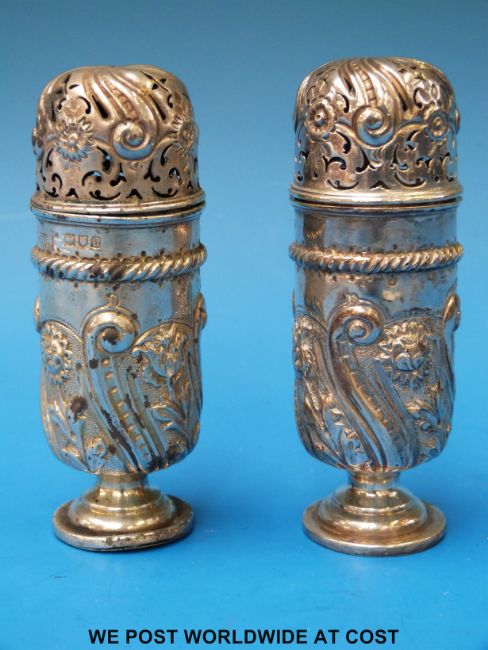 A hallmarked silver salt and pepper with embossed design (height 9.5cm)