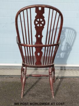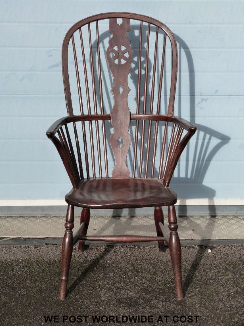 An elm seated Windsor armchair with cartwheel design to the pierced splat back