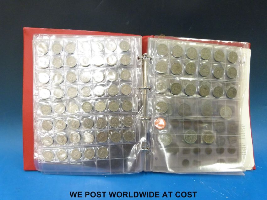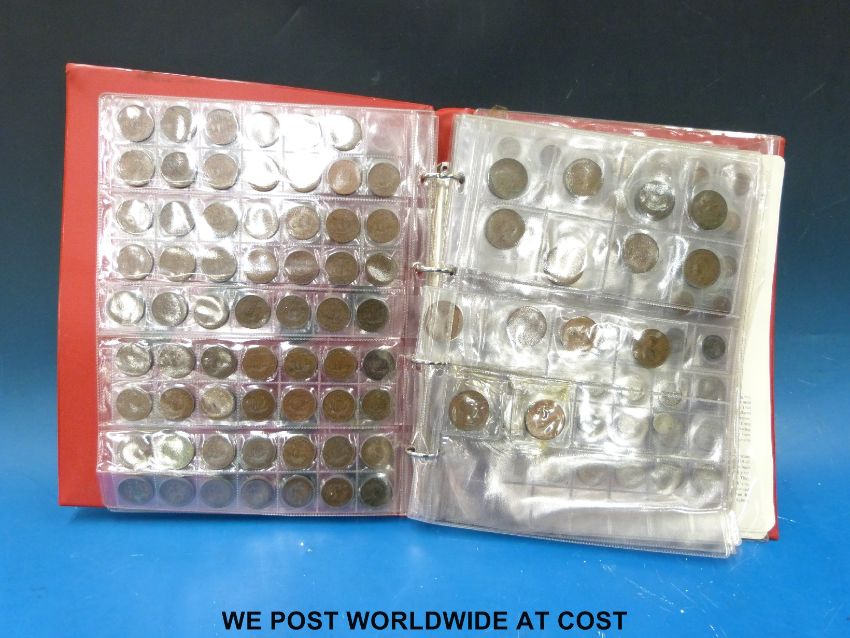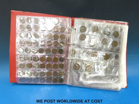 A red 'Magpie Collectors' coin album containing schoolboy/ amateur collection of coins including Georgian crown, cartwheels, silver content, Victorian overseas including pre 1945 USA etc, together with some largely commemorative stamps