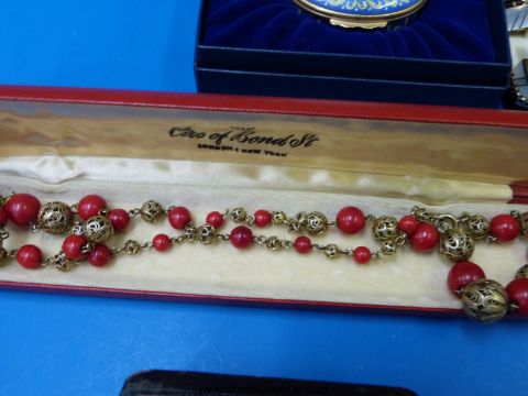 A filigree necklace by Ciro of Bond Street, Wedgwood cufflinks, a silver coin, bracelets, Halcyon Days enamel pill box etc