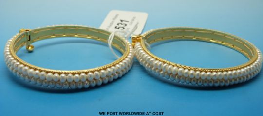 Two yellow metal bangles each set with two rows of pearls, bought from Sri Jagdamba, India