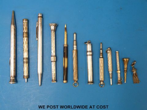 A hallmarked silver pencil, three white metal pens, two white metal pencils with chased decoration and agate set to the tops and a yellow metal and horn tooth pick etc