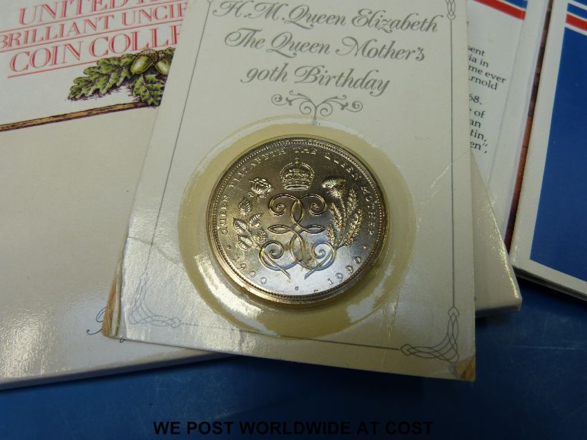 Five uncirculated UK coin collection packs together with a £5 and a £1 example