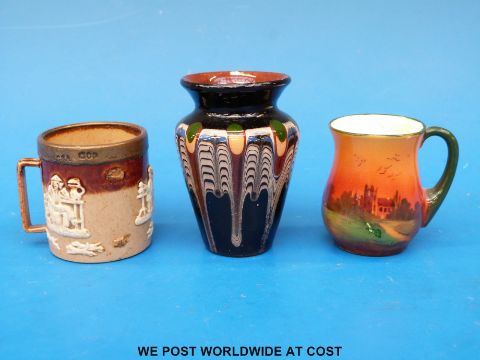 A miniature Royal Doulton Lambeth mug with silver hallmarked top together with a miniature hand painted Royal Doulton example and a Stoke Pottery Burslem miniature vase (unmarked). Vendor's family worked at Prices's early 20thC, miniature vase possible trainees piece