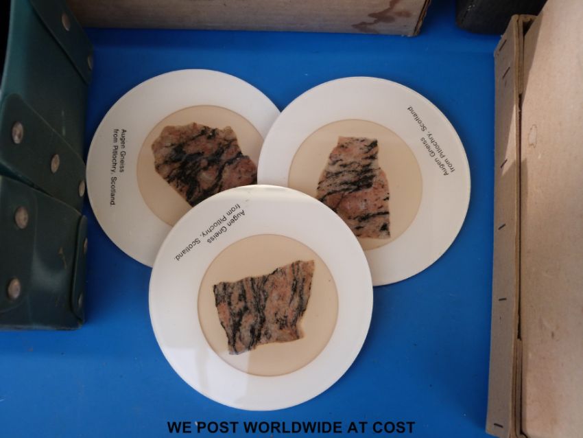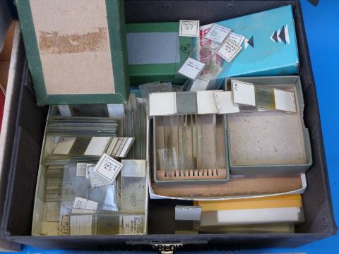 A box of microscope slides, many named and of geological interest, place names on many from various worldwide locations, quarries and places of interest. Also contains a small collection of entomological slides, a box of microscope lenses, a UV lamp and coasters made from geological samples