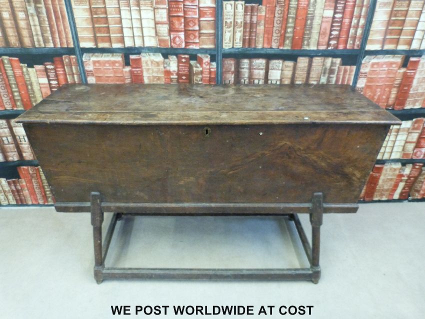 An antique elm dough bin with hinged lid, raised on turned legs united by moulded stretchers (H76, W139, D47cm)