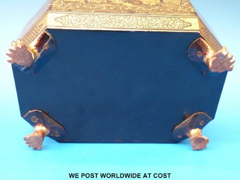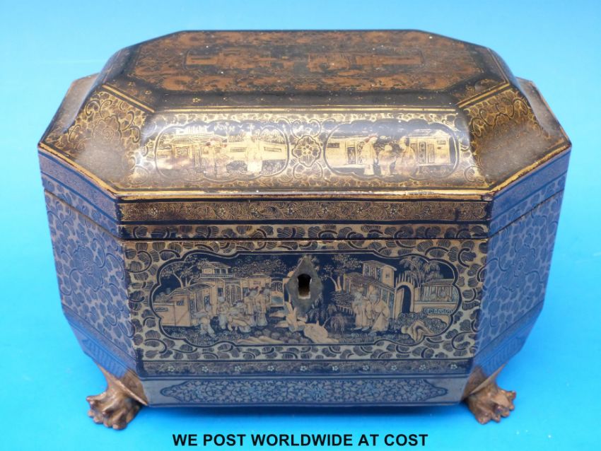 A 19thC Chinese lacquer papier maché tea caddy raised on lion pad feet (14cm tall)