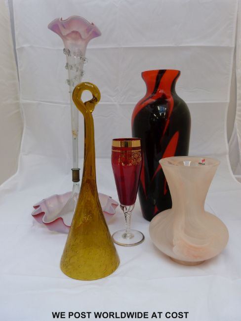 A quantity of coloured glass vases, paperweights etc including an epergne, Mdina, overlay etc
