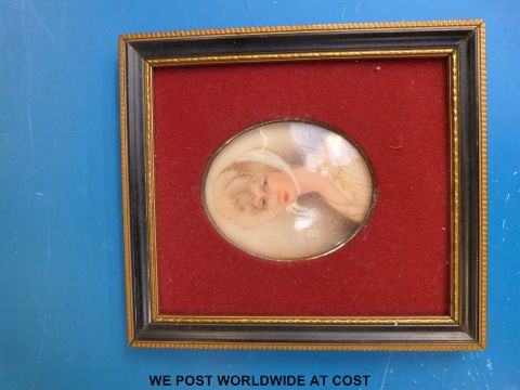 Miniature portrait of a woman inscribed verso as being by J.T Birch, miniature silhouette and miniature frame (max diameter 7.5cm)