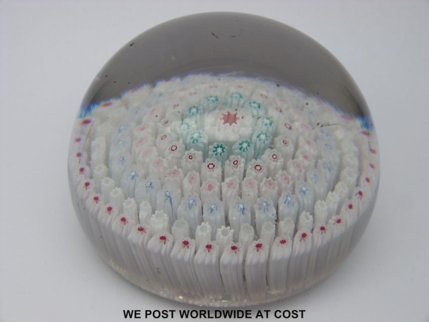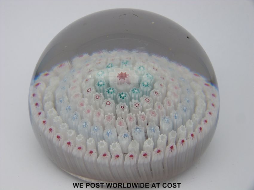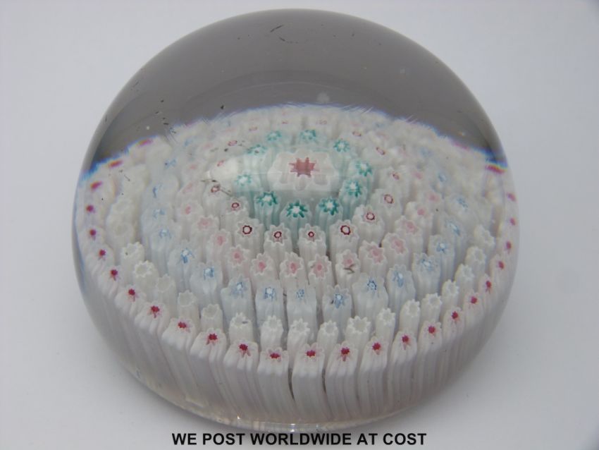 A Whitefriars millefiori paperweight with central large red and white cane surrounded by six rings of similar canes, 8.5cm diameter