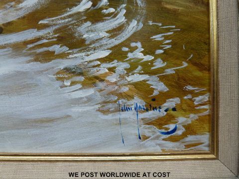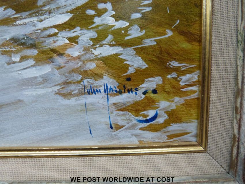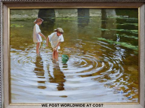 John Haskins oil on board children in stream, with 1995 receipt verso (29 x 39cm)