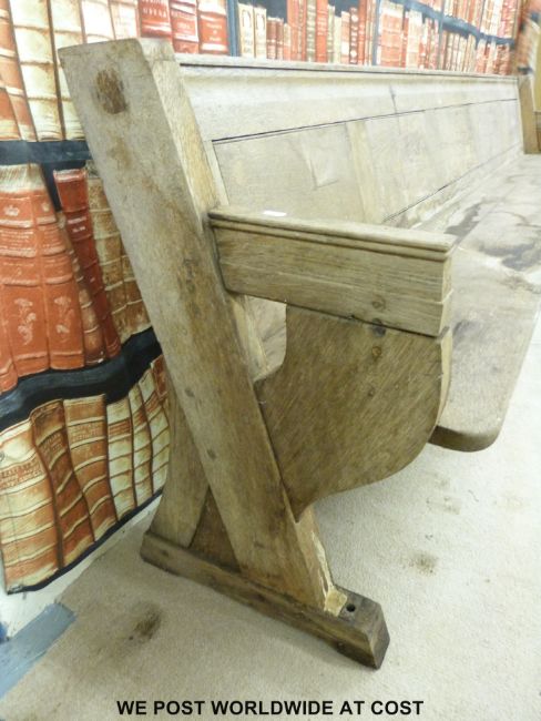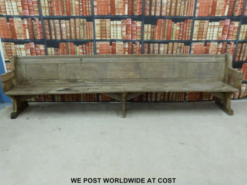 A substantial vintage oak pew with panelled back and bowed stretchers of peg jointed construction, perhaps Arts & Crafts era (length 308cm, height 82cm, depth 60cm)