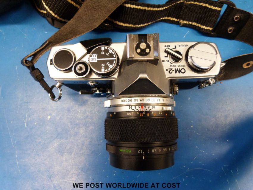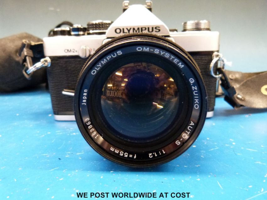 An Olympus OM-2N SLR camera fitted with a 55mm 1:1.2 Zuiko lens and a 1:2.8 f=28mm lens