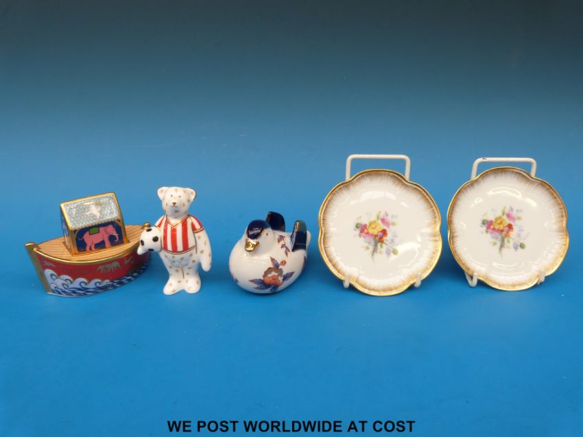 Three Royal Crown Derby paperweights together with two trinket dishes