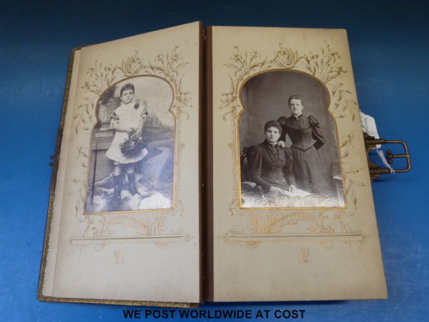 A leather-bound and clasped Victorian photograph album full of interesting family photographs, children, ladies, gentlemen, family groups etc
