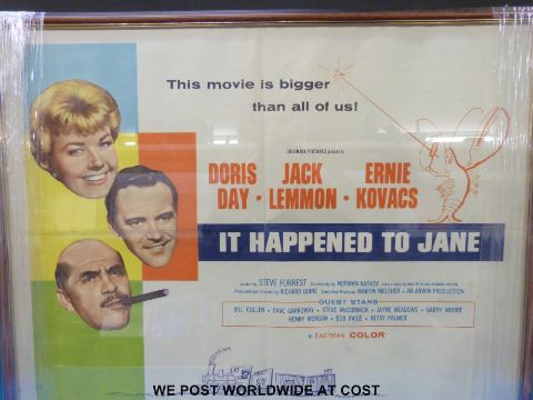 Two 1960s framed film posters, Doris Day, James Garner, Jack Lemmon in "Move Over Darling" and "It Happened to Jane"