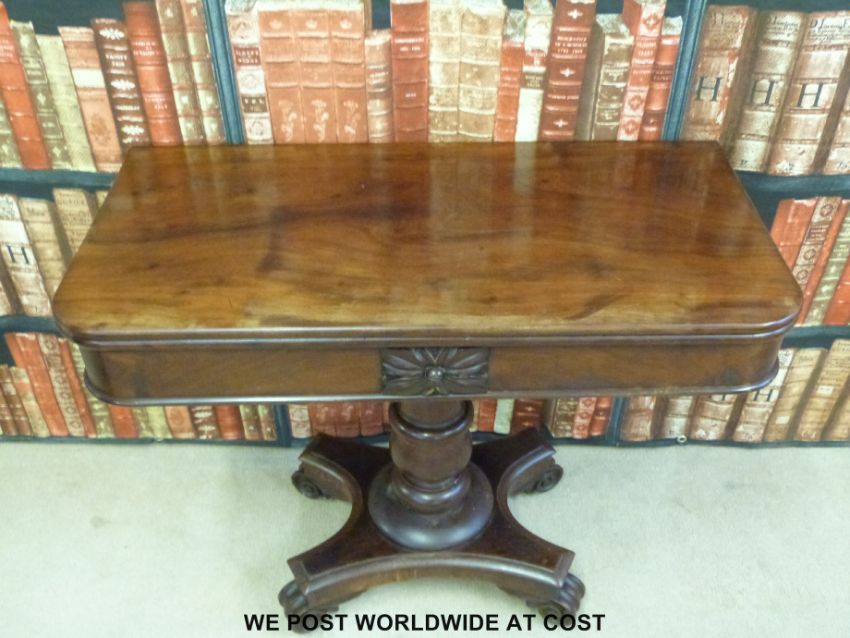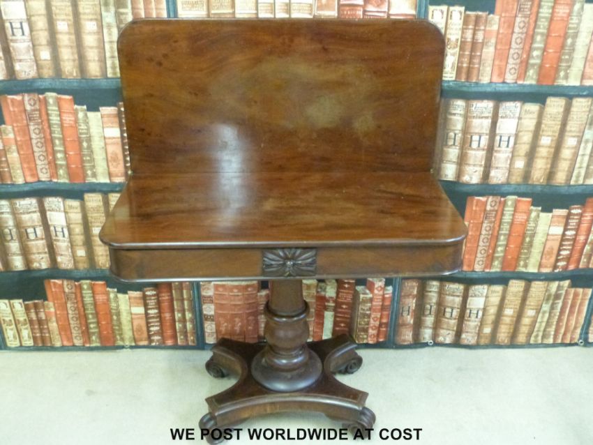 A 19thC mahogany fold over games table raised on a quatrefoil base and brass castors (W91cm)