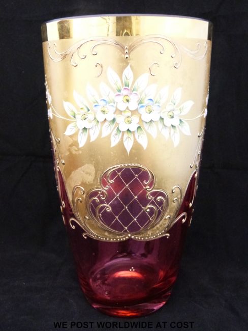 Two gilt and enamelled cranberry glass vases with applied flower decoration, (each 35cm tall)
