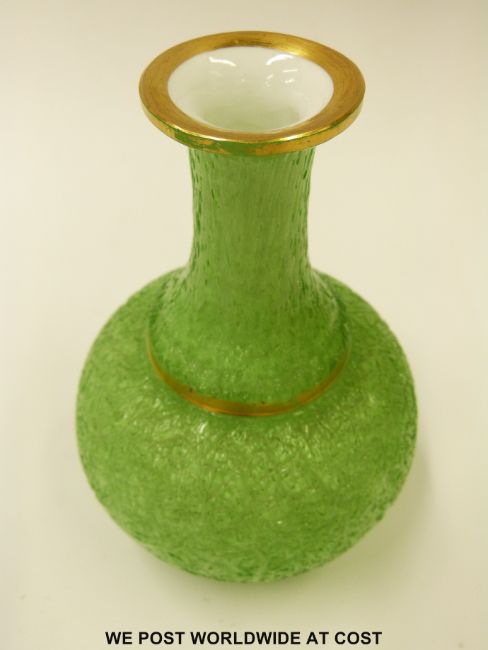 Bacarrat carafe and up with green textured body decorated in gilt to the rim and stopper (H18cm)