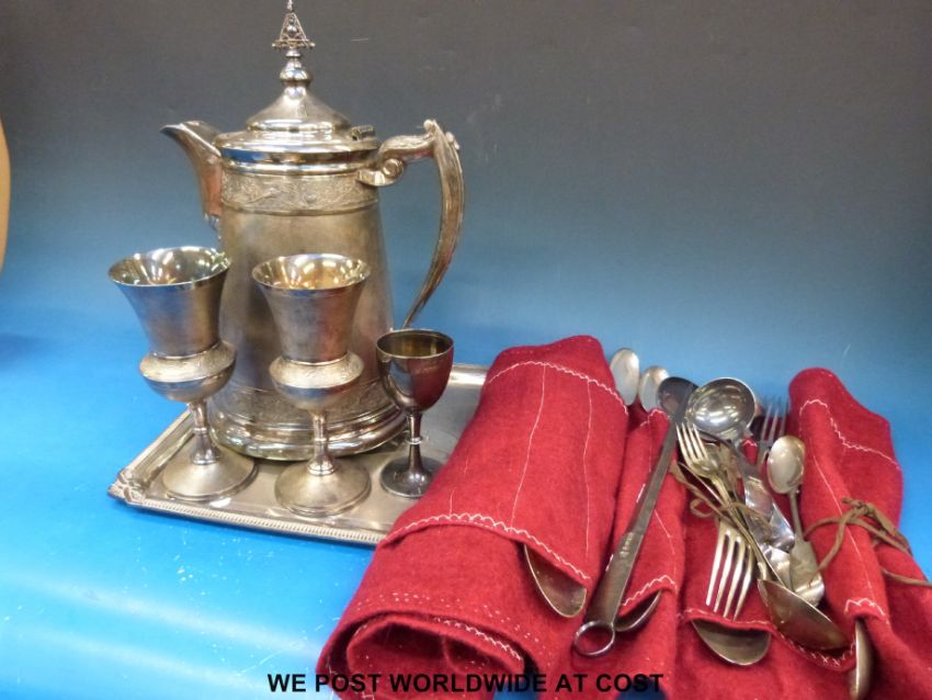 A collection of plated fiddle pattern cutlery and a skewer by Elkington & Co., plated ware including a large decorative jug with pierced finial (height 34cm) and "James Stimpson 1854 patented" to base together with a hallmarked silver goblet (weight 66g)