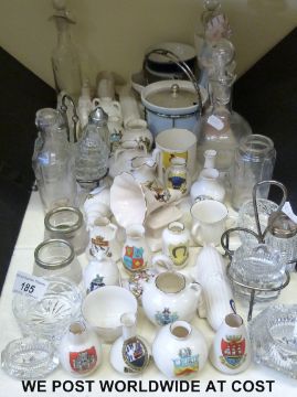 A collection of crested ware including Goss, Carlton Ware, a gramophone, Zeppelin etc together with cut glass salts, George Jones preserve pot etc