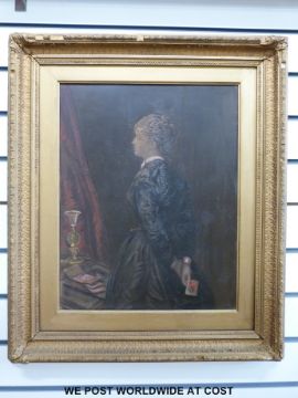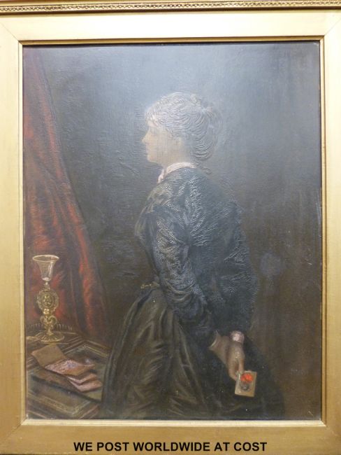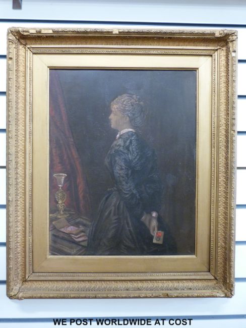 Gilt framed oileograph lady in period dress (48 x 38cm) together with an oil on canvas of flowers