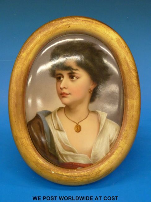 A KPM convex plaque decorated with a head and shoulders portrait of a pretty girl (27cm in length)