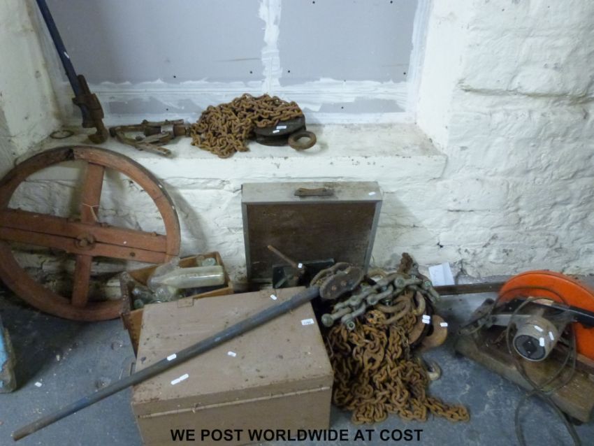 A quantity of engineering tools to include lifting equipment, Makita saw, puller etc