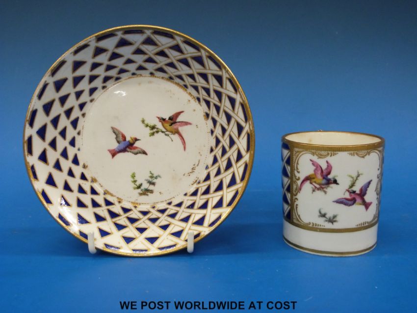 A Sevres style 19thC cup and saucer decorated with exotic birds, blue stamps to base