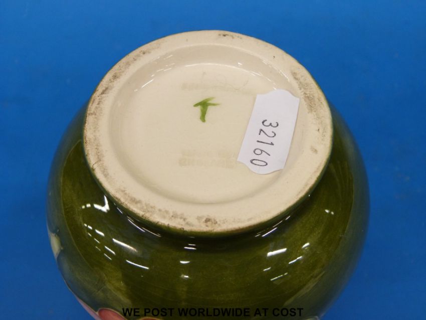 A Moorcroft pottery vase in Hibiscus pattern on a green ground (height 13cm)