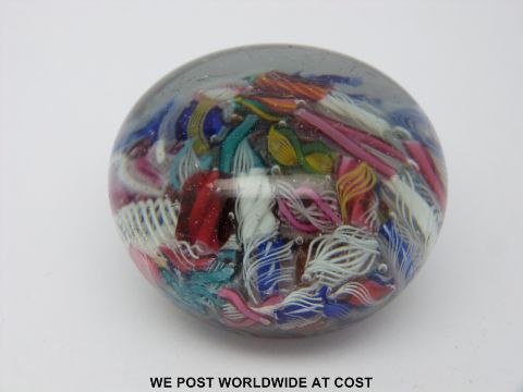 A scrambled glass paperweight with various multicoloured latticino tubes.
